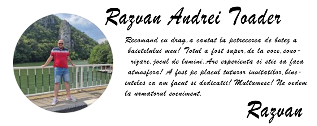 Daca rezonati cu acest stil modern Dj si solist cu tarabana , haideti sa punem la cale impreuna cea mai frumoasa petrecere. Fie ca este botez, cununie, logodna, nunta, nunta de argint, onomastica, reintalnire cu prietenii, petrecere de sfarsit de an sau party de orice fel. Fie ca sunt 25 de invitati, 50 sau 100, fie ca majoritatea sunteti tineri sau trecuti de varsta a doua. Fie ca genul muzical preferat de muzica este: pop, retro sau modern, club house, trap, muzica romaneasca de petrecere, lautareasca. Sau orientala(grec arab turk sarb makedon) ori balkanica si de ce nu, manele ! Alege dj Mc ,suntem alegerea perfecta pentru a mixa la petrecerea ta. Aici pe site veti gasi in Galerie: foto video si audio preluate de la evenimente, dar si multe recenzii de la clientii deserviti de-a lungul timpului. Dj nunta sau Formatie?